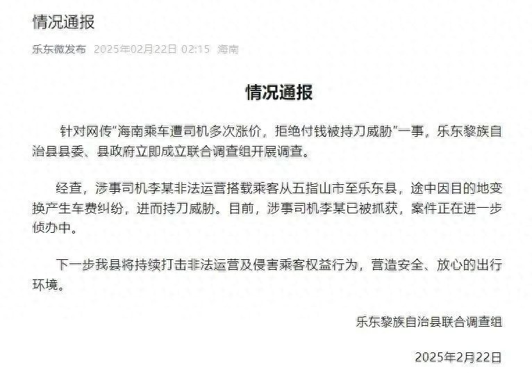 海南“乐东微发布”消息,乐东黎族自治县联合调查组2月22日发布情况通报:针对网传“海南乘车遭司机多次涨价,拒绝付钱被持刀威胁”一事,乐东黎族自治县县委、县政府立即成立联合调查组开展调查。经查,涉事司机李某非法运营搭载乘客从五指山市至乐东县,途中因目的地变换产生车费纠纷,进而持刀威胁。目前,涉事司机李某已被抓获,案件正在进一步侦办中。下一步我县将持续打击非法运营及侵害乘客权益行为,营造安全、放心的出行环境。